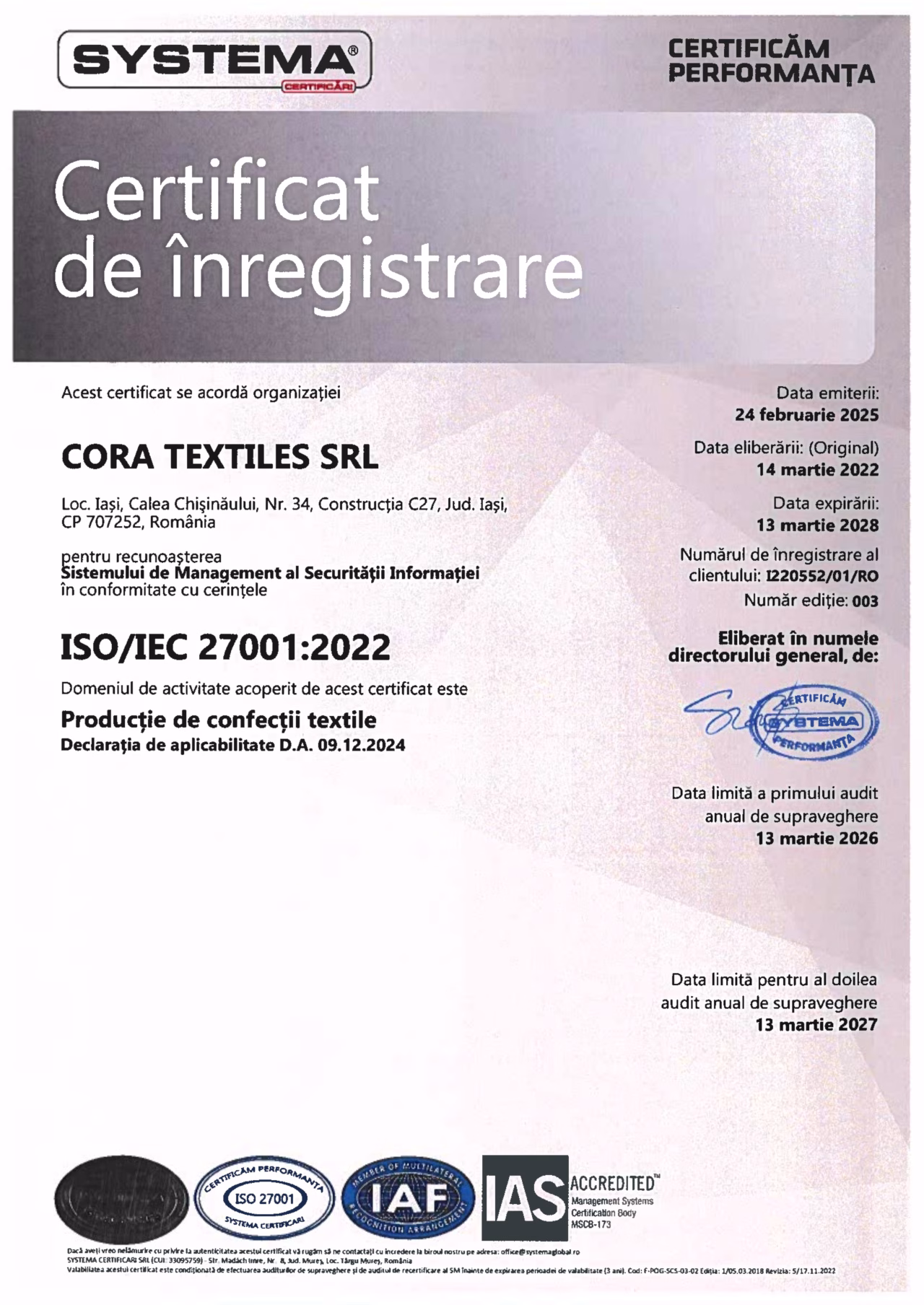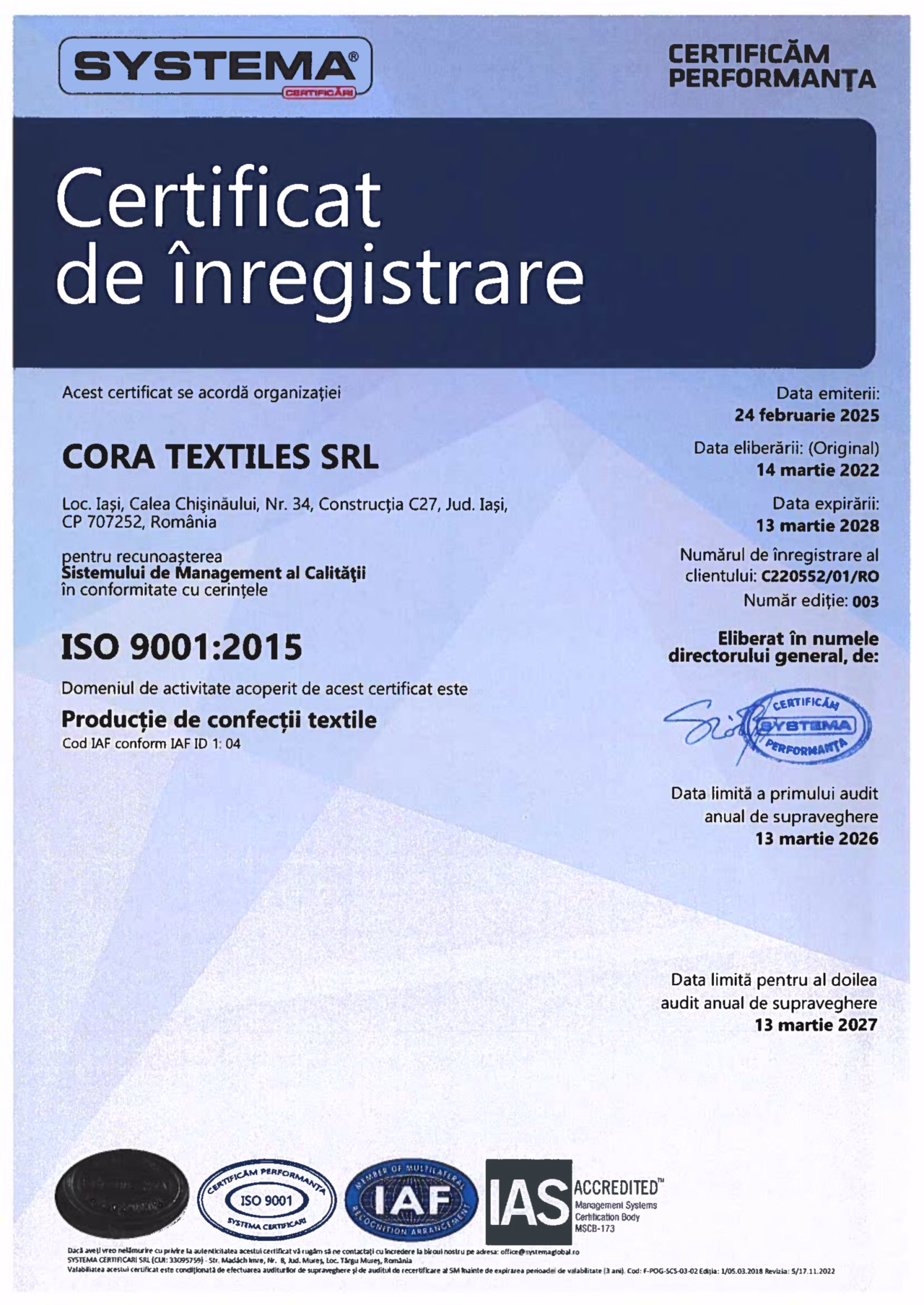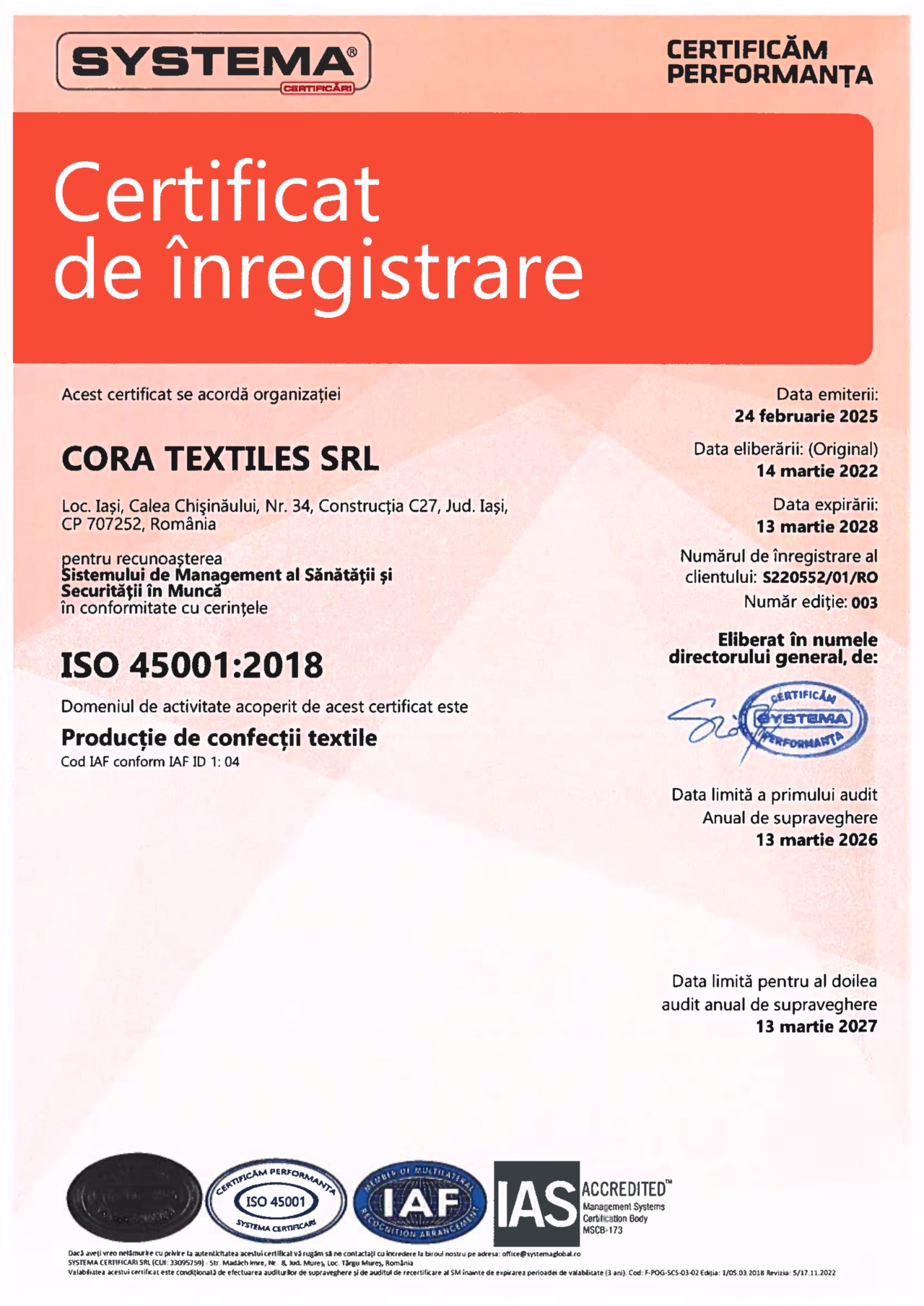CORA TEXTILES received a high distinction from TRADE CHAMBER for our activity in Textile Industry, as well as, a recognition of our position in the business environment: